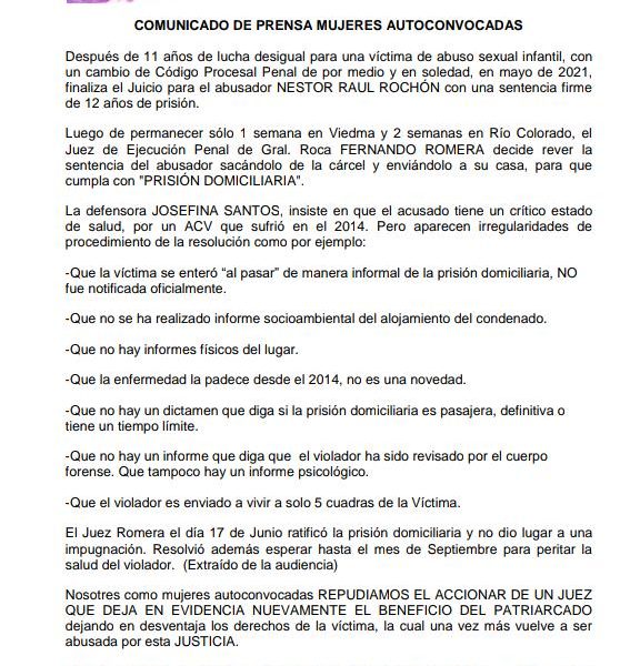 Las mujeres auto convocadas que se manifestaron en la tarde de hoy frente a la Casa de la Justicia en Río Colorado, marcharon frente al domicilio...